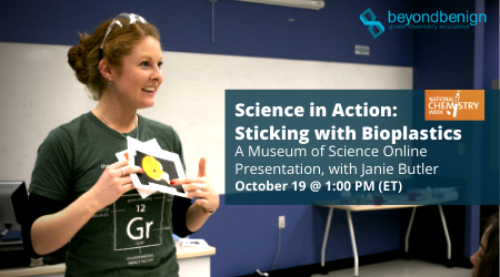 As part of National Chemistry Week, our very own Janie Butler presenting how to make bioplastics in your very own kitchen. With our increase in reliance on plastics, why not start thinking about how we can start making them differently? Through her presentation you will learn how to make your own window cling. In collaboration with Museum of Science, this presentation was both engaging and entertaining. Watch here.