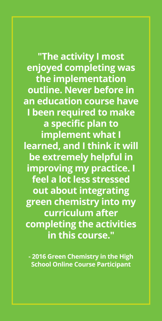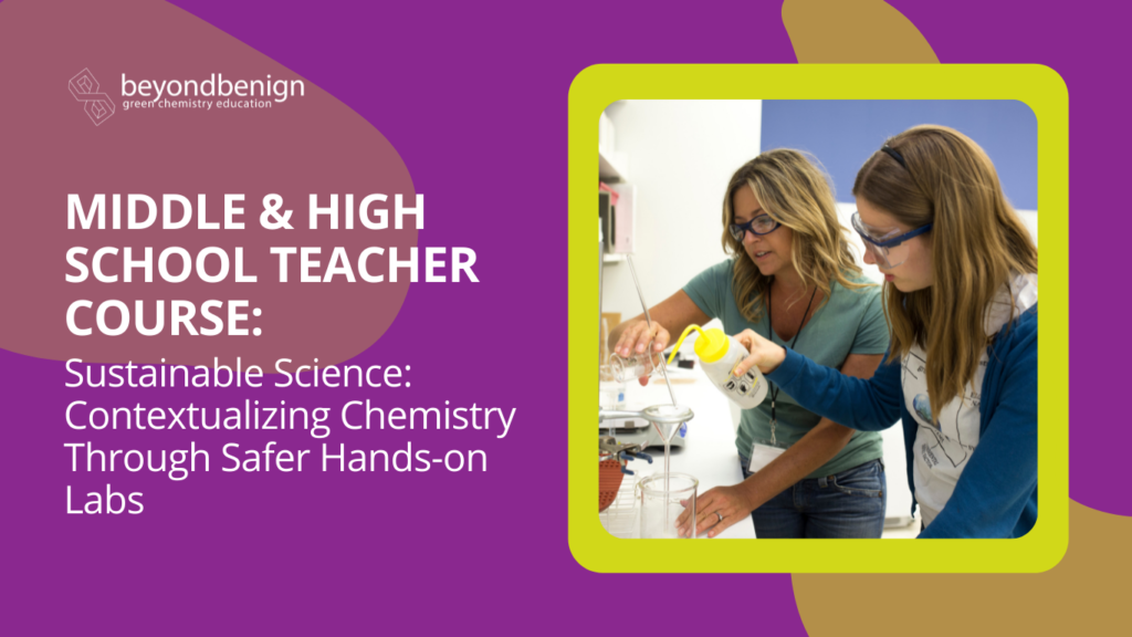 Beyond Benign’s online professional development courses are taught by Beyond Benign Lead Teachers who have extensive experience teaching green chemistry in their classroom and developing green chemistry curriculum. Both courses have optional graduate education credits available from Colorado School of Mines Continuing and Professional Education Services & Teacher Enhancement Program (1 graduate level credit or 3 graduate credits).