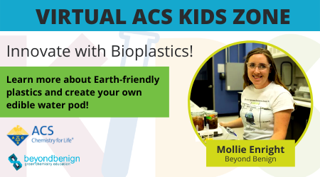 Mollie Enright, our Graduate Student Liaison, has just participated in the Virtual ACS Kids Zone! This event allowed the general public to explore the wonders of chemistry by featuring popular STEM advocates showing different hands-on activities! With the “Innovate with Bioplastics” activity, Mollie showed how you can create your own edible water pods and also discussed the importance of Earth-friendly plastics! To access Mollie’s and other presentations at the ACS Kids Zone, just click here!